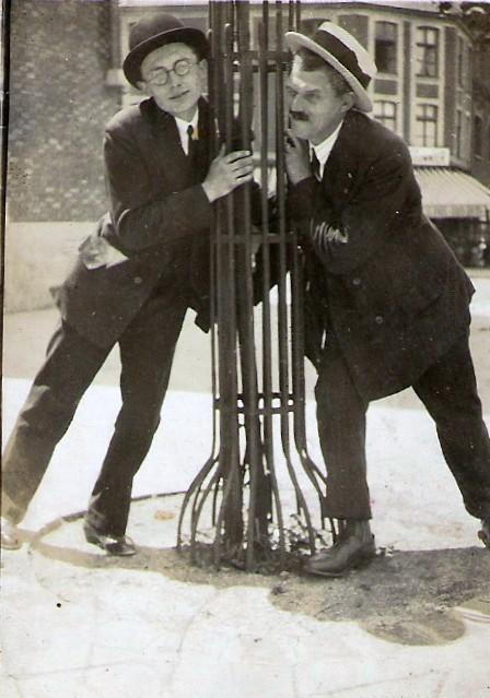 Cette photo ancienne, avec ses deux personnages en costume et chapeau, penchés sur une structure métallique qui évoque un objet insolite ou une machine mystérieuse, rappelle fortement l’univers des comédies burlesque des années 1920-1930. À droite, chapeau clair et moustache impeccable, Eugène Delépine, mon grand-père. À gauche, lunettes rondes et regard amusé, son ami Maurice Plet. Les deux hommes, en complet sombre, posent ici avec une décontraction presque théâtrale, comme s’ils sortaient tout droit d’un film muet. On croirait voir un plan effacé de Charlot ou de Laurel et Hardy : un instant suspendu entre humour et tendresse.